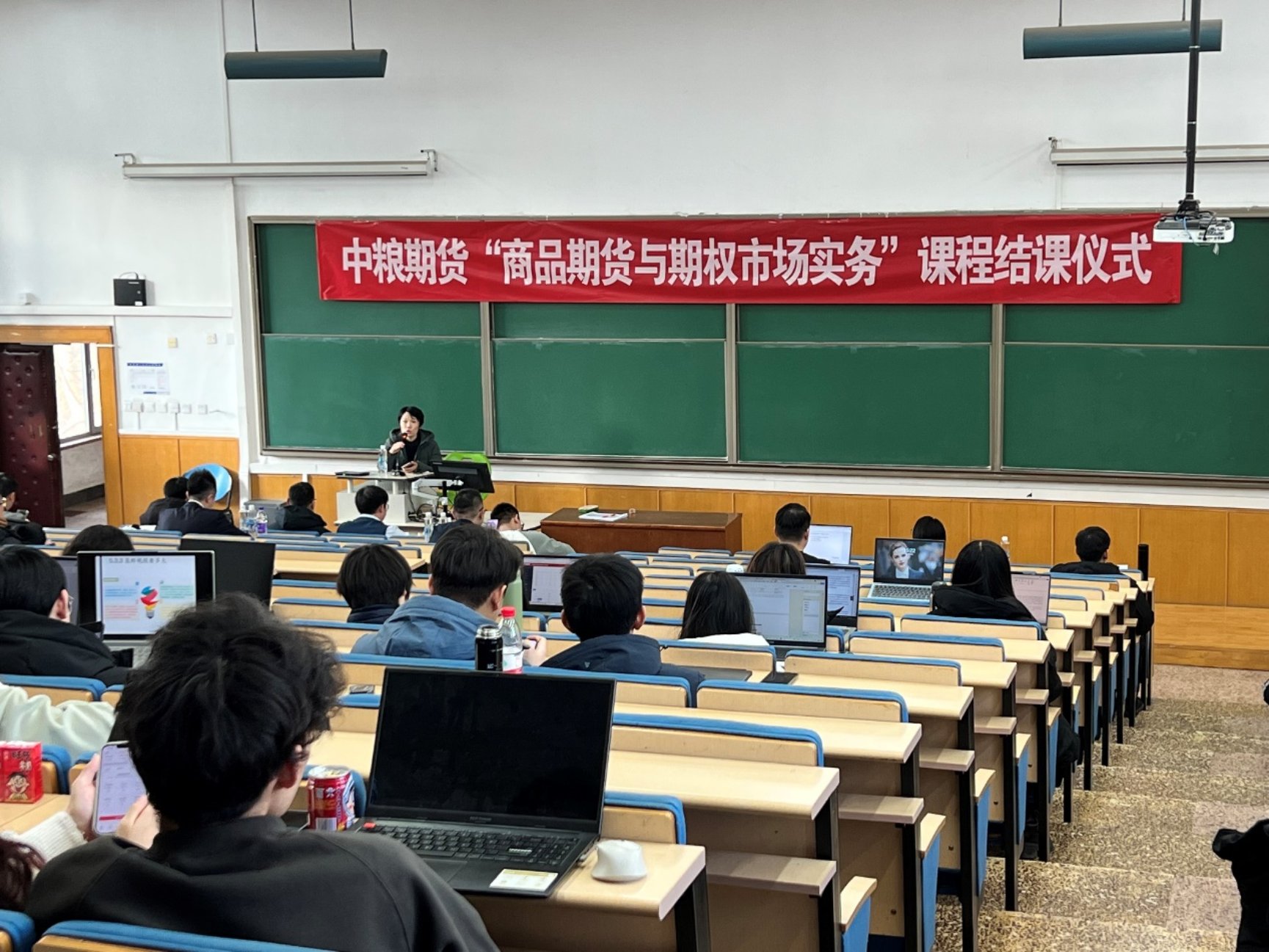 2023年12月27日下午,中粮期货“商品期货与期权市场实务”课程结课仪式在博学楼301顺利举行。中粮期货研究院院长李楠,中粮期货研究院院长助理任伟,中粮期货农产品版块资深研究员张如峰、张大龙,中粮期货工业品版块资深研究员陈阵、刘佳良,中粮期货航运研究员、课程联系人塔林夫,果冻传媒 院长王天一,金融工程与金融科技教师党支部书记聂晶,金融工程系教师冯建芬,以及《商品期货与期权市场实务》所有选课学生、本科生课程《金融工程学》部分选课学生出席了此次结课仪式。冯建芬老师主持了此次仪式。