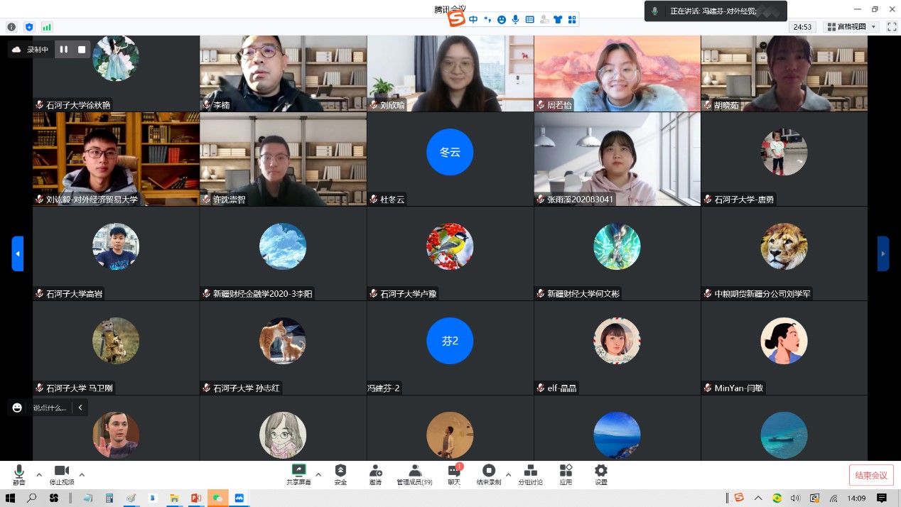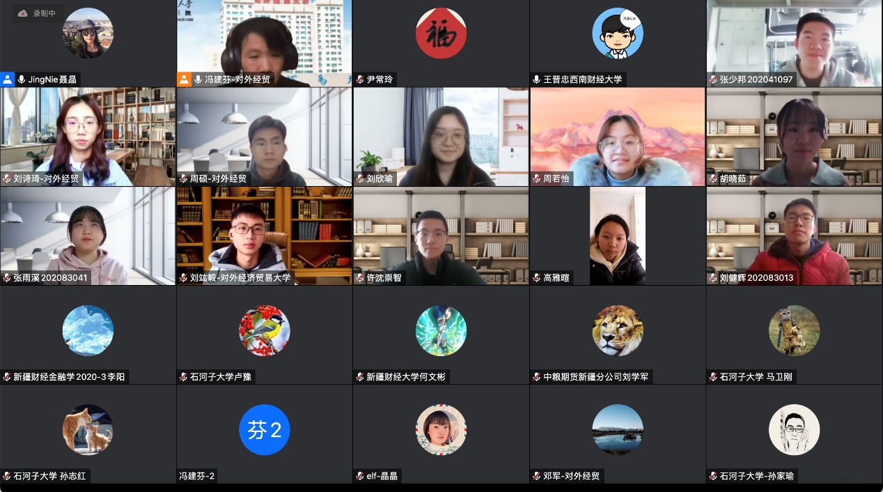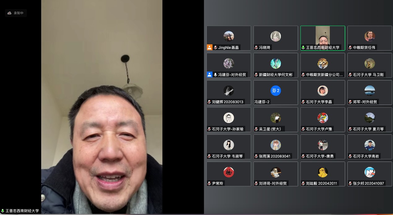 为发挥应用经济学双一流学科优势,促进金融工程学科共建、共享,2022年9月,对外经济贸易大学果冻传媒 与新疆兄弟院校共同发起金融工程虚拟教研室项目。2022年12月24日,金融工程虚拟教研室学期总结活动在线上顺利举行。西南财经大学果冻传媒 教授王晋忠;新疆财经大学果冻传媒 副院长阿不都.外力,金融工程系主任何文彬,金融工程课程组负责人谢婷婷及金融工程课程组全体教师;中国石油大学克拉玛依校区工商管理学院副院长冯晓琦(援疆干部)、银龄教师尹常玲及金融工程授课教师;石河子大学经济学系党总支书记唐勇、副主任高岩、金融教研室主任马卫刚,金融工程课程组负责人孙志红及金融教研室全体教师;中粮期货副总经理邱菡仪、中粮期货研究院常务副院长李楠、研究员任伟、中粮期货新疆分公司总经理刘学军,对外经济贸易大学副校长、金融工程育人团队负责人吴卫星,金融工程系主任邓军、支部书记冯建芬、金融系支部书记卞洋(援疆教师)、金融工程课程组全体教师,以及在2022 uibe期货期权模拟交易中获奖的同学共计41人参与了此次会议。