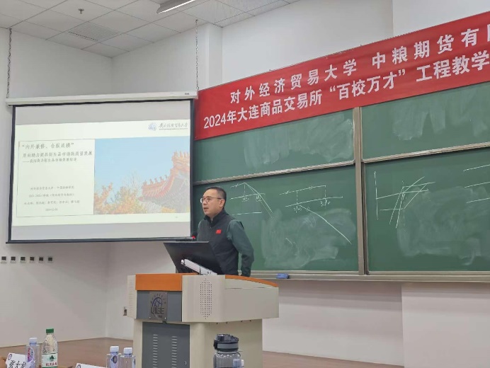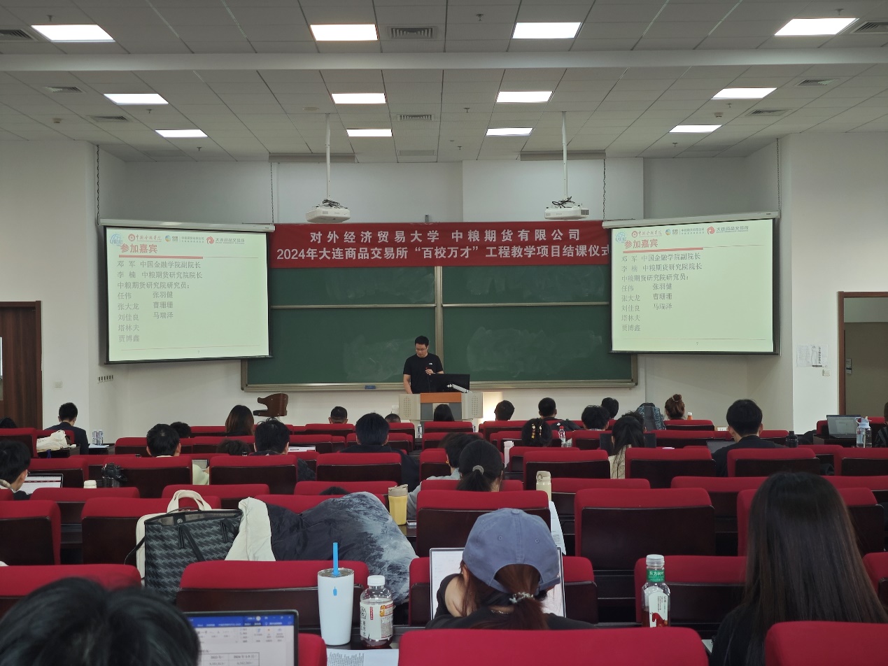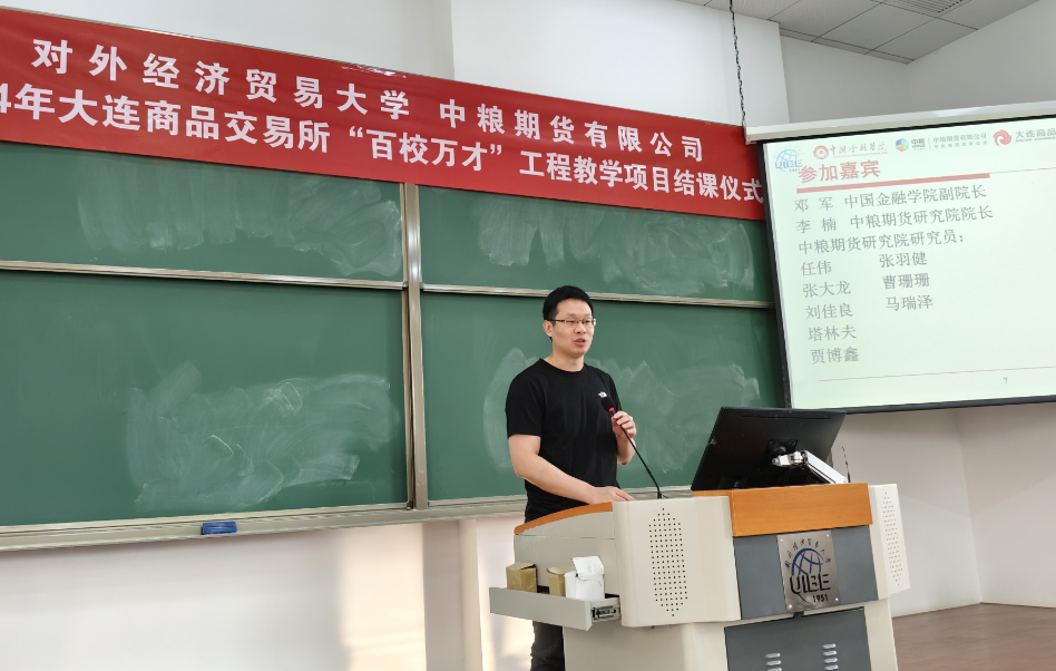 2024年12月25日下午,《商品期货与期权》结课仪式在对外经济贸易大学求索楼402教室成功举办,本课程受到2024年大连商品交易所“百校万才”教学A类项目的大力支持。果冻传媒 副院长邓军,中粮期货研究院院长李楠,以及研究员任伟、张大龙、刘佳良、贾博鑫、张羽健、曹珊珊作为案例指导教师和评审专家,研究员塔林夫作为项目联系人和课程企业联系人,与选课的88位同学共同参与了此次结课仪式。仪式由项目校方负责人、金融工程系教授冯建芬主持。