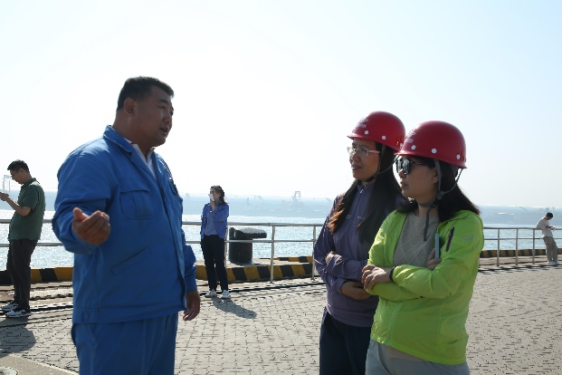 最后,师生来到成品运输码头,运输部负责人详细介绍了码头的功能和公司的运输优势。负责人特别提到,首钢京唐公司目前已实现水运、陆运、铁运三路无缝衔接,同时承担着首钢集团下属迁钢公司、顺义冷轧的海运发运任务。这一物流优势在2020年新冠肺炎疫情期间和2023年7月暴雨期间为保障企业生产顺稳起到了重要作用。
