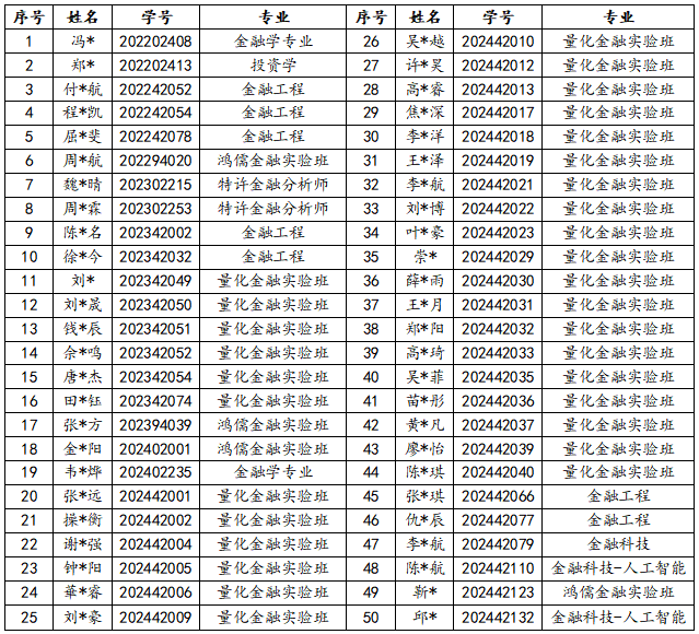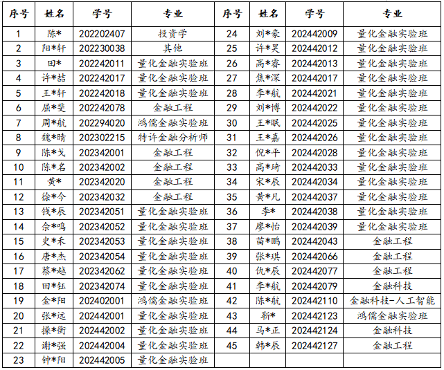 为切实强化专业实训实践教学,着力培育学生卓越的应用技能,我院金融工程专业2025年暑期实训项目已完成学员遴选工作。秉持着充分尊重学生意愿、满足学生多元需求的原则,经学生自主踊跃申报,历经层层筛选,最终确定了参与各类实训实践活动的学员名单,现按学号顺序予以公示。