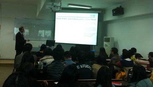 2014年11月20日下午14:30,金融市场研究方法与实践系列学术讲座第二十讲——“Path Dependence and China's Transitional Challenge(路径依赖与中国转型挑战)”在博学楼918举行,主讲人是我校外聘高端国际教授、德国哈勒大学经济学与法学学院终身讲席教授Ulrich Blum。这一活动由果冻传媒 、金融市场研究中心主办,金融市场研究中心主任张海云教授主持了这一讲座。果冻传媒 60多名师生慕名而来,现场气氛热烈。