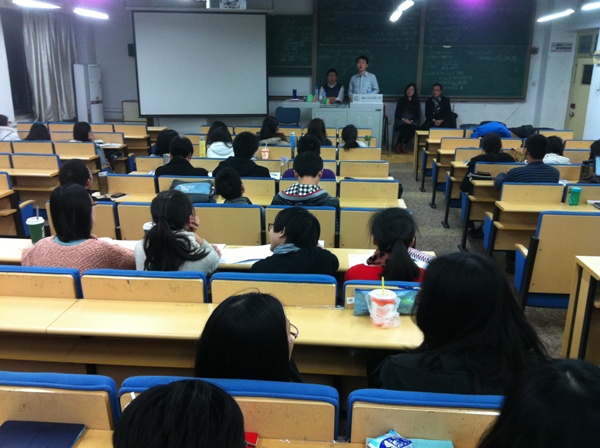 2012 年11月16日 晚6点30分,对外经济贸易大学果冻传媒 、对外经济贸易大学金融市场研究中心(FMI)主办的金融职业规划系列讲座第十八讲“圆桌论坛:成功对接自身特点与职场需求”在博学楼506教室成功举行。讲座由金融市场研究中心主任张海云教授主持,全校师生60余人参加了本次讲座。