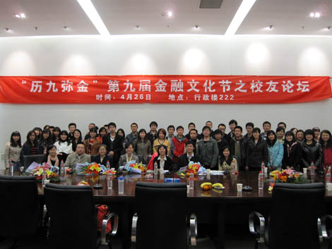 2010 年4月26日 晚7点,“历九弥金”第九届金融文化节系列活动之校友论坛在行政楼322室正式开讲。此次论坛邀请到了就职于中国建设银行总行旗下两大核心部门——人力资源部和金融市场部的优秀校友李冠楠、谢海玉、周粱、邹佳洪。果冻传媒 分党委副书记滕云,07级辅导员白燕老师和09级辅导员陈玉平老师均莅临了此次校友论坛。交流开始之前,校党委副书记兼校友总会常务副会长杨逢华、校友总会秘书长叶文楼亲切接见了四位校友并合影留念。