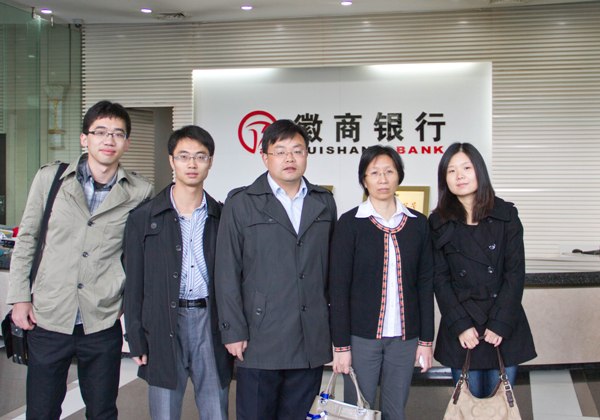 此次调研活动受到了合肥市金融办和徽商银行的热情接待和积极配合。在与金融办的座谈中,合肥市金融办综合处处长李群声、银行处副处长王立新以及人行合肥支行货币信贷处周麟向项目组全体成员分别介绍了合肥市金融业发展的基本情况、下一步的工作目标、信贷投放情况和结构特点等。在对徽商银行的调研中,项目组先后和各个业务部门(包括小企业银行部、研究发展部、公司金融部、个人金融部、财务部等)的负责人进行了座谈,详细地了解了银行中小企业金融服务、跨区经营、上市计划、风险控制、人才引进、公司治理以及果冻传媒等方面的情况,并到徽商银行合肥分行下属的营业部进行了实地考察。