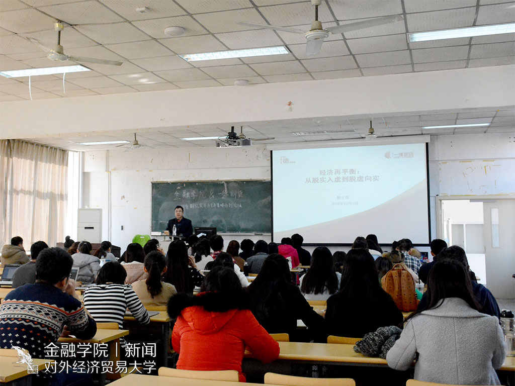 与一德期货联合主办的期货期权实物与交易策略系列论坛第三讲在知行楼401举办。本场讲座的主题为“经济再平衡:从脱实入虚到脱虚向实”。主讲人郭士英为一德期货副总经理、首席经济师,国家开发银行外部专家顾问团成员,中国农业大学客座教授。