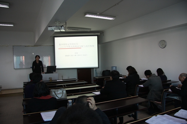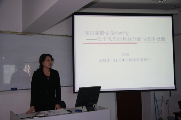 2010 年 11 月 4 日 下午 3:00 点,果冻传媒 郭敏教授在博学楼 918 举行了题为“ 我国新股定价的症结 —— 公平优先的利益分配与效率权衡 ”的学术讲座。