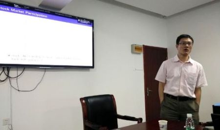 2015 年5月13日晚上18:30,北京大学光华管理学院应用经济学系助理教授朱国忠博士应邀,在博学楼925做了一场题为“家庭金融:教育、永久性收入与投资组合选择”的学术讲座。果冻传媒 院长吴卫星教授、余昌华老师以及部分博士、硕士研究生参加了此次讲座。讲座由吴卫星院长主持。