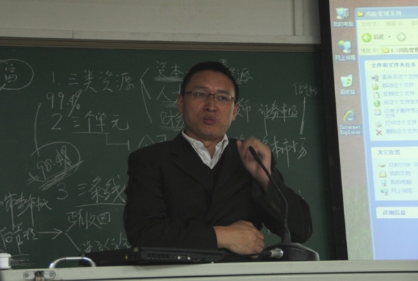六点半,课程正式开始,潘慧峰老师首先向同学们介绍了这门课的上课形式以及课程大纲,然后介绍了演讲嘉宾——中信银行总行授信审批部的副总经理冯燮刚博士的学历和工作经历。接下来,冯博士正式开始讲座,他在讲座中引入了竞争机制,将同学们分成了男生组和女生组,鼓励同学们积极回答问题,参与课堂讨论。