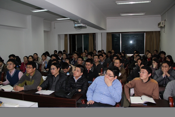 在一阵热烈的掌声中, 孙健博士开始了学术讲座。他首先介绍了远期合同的定义与定价方式,并详细分析了指数远期和商品远期的区别、远期合同和期权的区别。 孙健博士强调,衍生品与现货的价格间的内在联系依赖于无套利关系,与交易者的预期无关,其根源在于市场参与者的套利和对冲操作决定了衍生品的价格。 孙健博士还指出,收益函数为资产价格的线性函数时,定价较为简单。随后,孙健以 Libor远期为例,说明了利率衍生品交割时间与定价复杂程度的密切关系。 孙健博士指出, Libor远期的收益函数虽然对于 Libor呈线性关系,但对于零息债券价格是否呈线性关系则取决于交割时间的选取。因而,交割时间的选取决定了对冲复制的复杂程度,因而决定了利率衍生品定价的复杂程度。之后,孙健又外汇远期为例,强调衍生品价格的正确价格对应于对冲复制而非交易者的预期。最后, 孙健博士介绍了对冲基金的发展简史和如今采用较多的对冲基金交易策略,有相对价值策略、事件策略和机会性策略。其中 孙健博士详细介绍了相对价值理论下固定收益策略的实施。