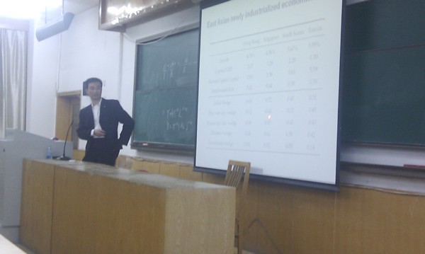 4 月20日 ,美国南加州大学经济学博士赵洪春(现为华中科技大学讲师)演讲了“经济增长的一种核算方法”:正如Chari(2007)等人指出,许多增长理论在解释实际经济的摩擦时,采用了与解释完全竞争经济一样的方法,就是引入外生的税收。在此思想的基础上,赵博士通过自己的研究设计了一种核算方法,来确定导致经济增长的基本因素。在他的模型中,以含税收的两部门新古典增长模型为初始经济,在其达到均衡时确定了一些“税收楔子”(wedge)。这些“税收楔子”作为解释经济长期增长的外生变量,与其它单部门的经济变量无关。更进一步,“税收楔子”在解释经济长期增长率时的重要作用可以通过原始经济模型来评估。将该模型运用于50个国家,实证结果表明,在7个税收楔子中,有2个税收楔子分别与生产函数以及经济的动态欧拉方程相关,这两个“税收楔子”在解释经济增长方面显得尤为重要。