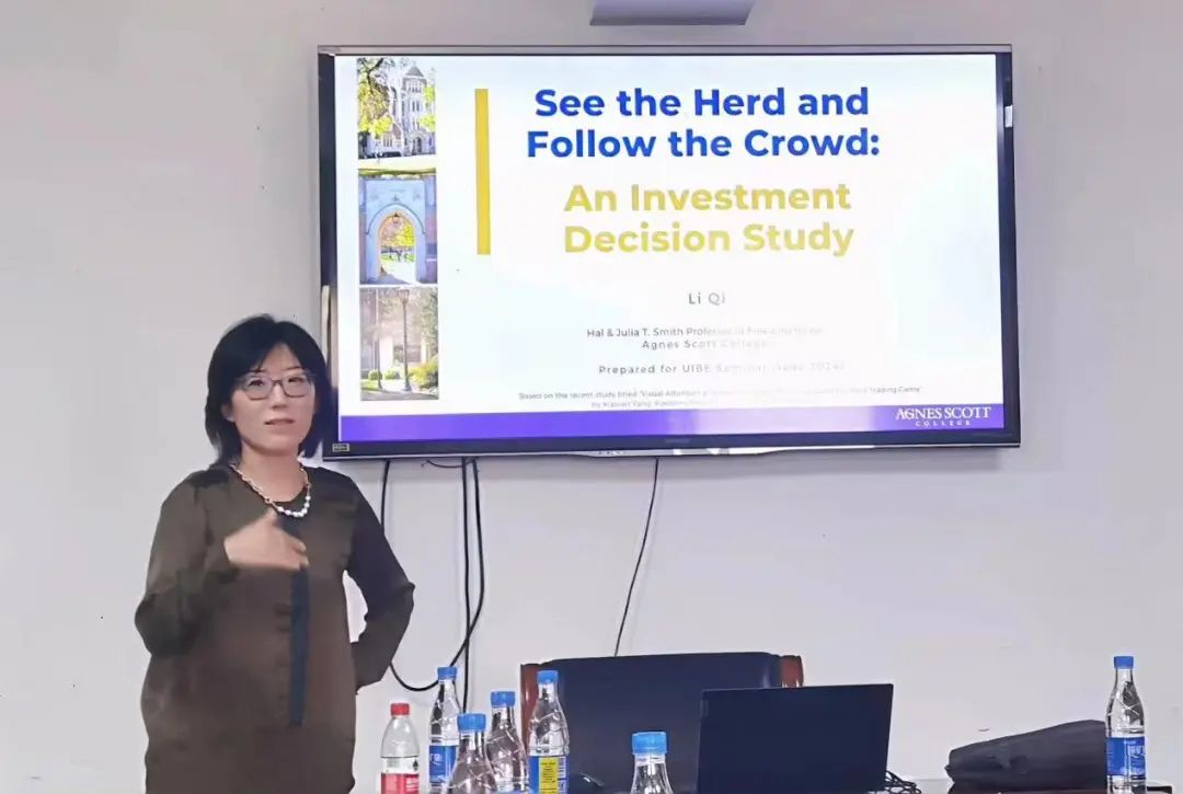 齐力教授为学院师生带来题为“See the Herd and Follow the Crowd: An Investment Decision Study”的精彩报告。齐教授首先介绍了研究背景和核心问题,即聚焦视觉神经和投资行为的研究,关注视觉行为与注意力分配对于股票交易中羊群行为的影响,并从学科理论出发,对于行为金融学在经济学中的地位进行梳理。齐力教授接着提出注意力和决策、羊群行为与决策相关的假说,阐释文章对于价格等因素的实验设计,以相对注视时长和注视偏差度量注意力,以及利用热力图捕捉眼动实验中的注意力,发现当私人信息与他人行为不一致时、在锦标赛激励而非线性激励中,决策者更容易产生投资羊群行为。齐教授进一步对响应时长、观看信息的顺序等进行解读,证实了文章结论的稳健性。最后,齐教授对于文章的不足之处比如因果关系等问题进行了深入讨论。