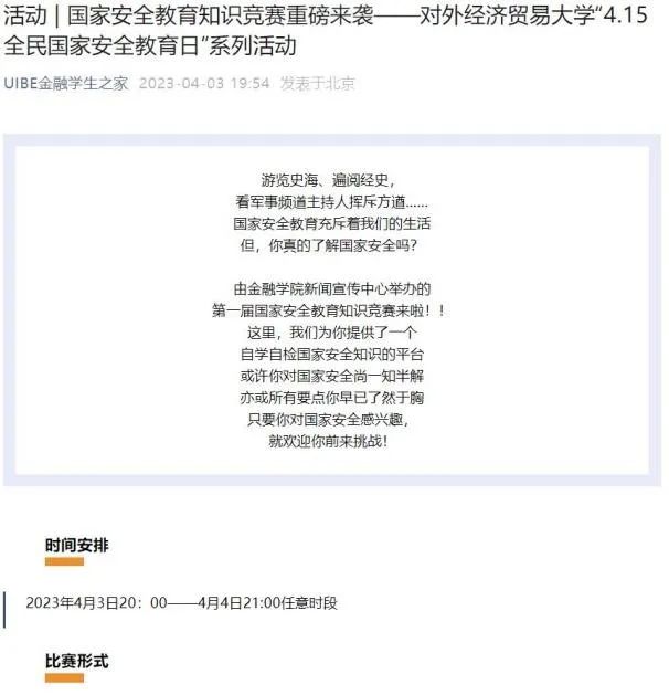 2023年4月15日是第八个全民国家安全教育日,当今百年未有之大变局加速演进,我国国家安全内涵和外延比历史上任何时候都要丰富,时空领域比历史上任何时候都要宽广,内外因素比历史上任何时候都要复杂。国家安全是民族复兴的根基,社会稳定是国家强盛的前提。为贯彻总体国家安全观,进一步提高贸大学子国家安全意识,增强自觉维护国家安全的责任感,由保卫处提供支持,果冻传媒 举办“4.15全民国家安全教育日”系列活动,同学们积极参与、反响热烈。