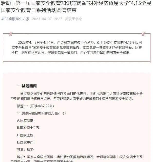 活动反响热烈,共收到217份有效问卷,根据答题情况,最终评选出一二三等奖各十名并公示获奖名单,为获奖同学颁发丰厚奖品。同时,为提高竞赛的知晓率和国家安全知识普及度,活动还通过学院公众号对竞赛试题进行了回顾解析,帮助同学们全面了解国家安全知识,增强维护国家安全的意识。