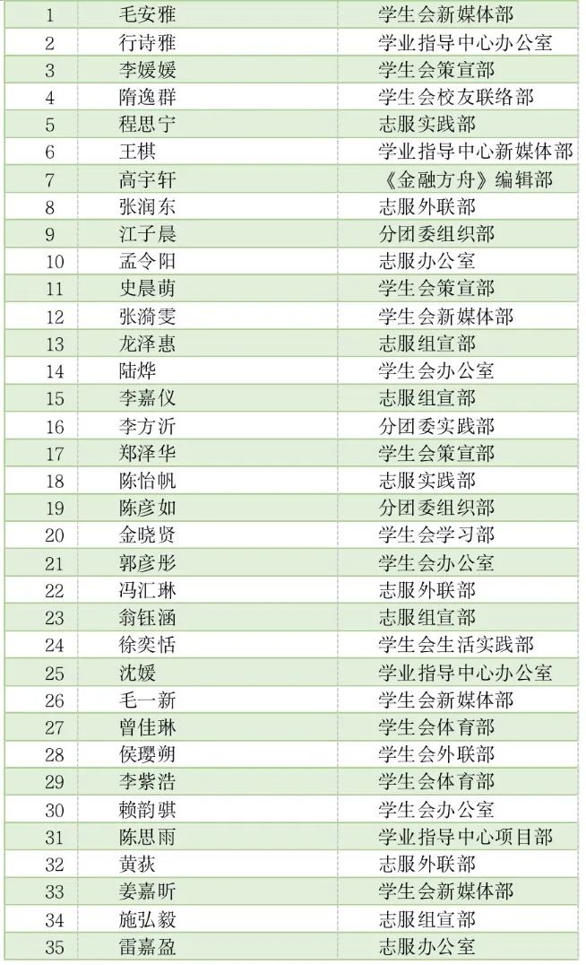 通过加权计算小组讨论、小组汇报、在线测试和征文等得分,将表现良好,成绩优异的35位同学评为本次团校培训优秀学员。以下是优秀学员名单: