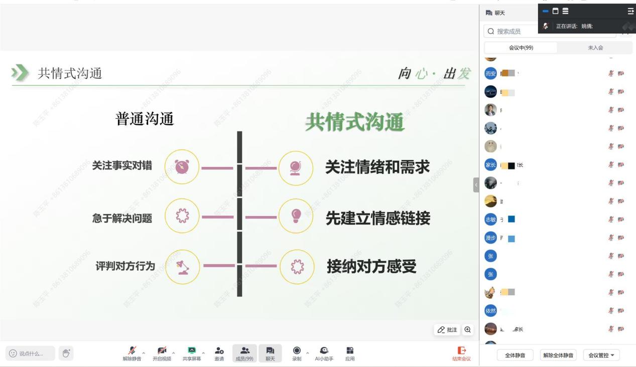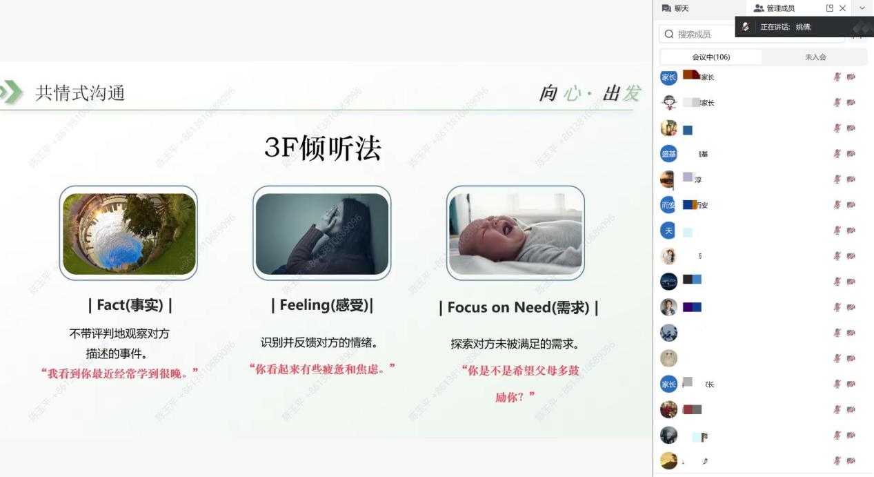 讲座伊始,姚老师以如何解读“Emoji表情包”的内涵入手,阐述了“共情式沟通”理念。通过“孩子线性代数考试失利”等典型案例,对比了普通沟通与共情式沟通的实践差异。现场演示的“3F倾听法”(Fact事实-Feeling感受-Focus on Need需求)和“共情+表达感受+提出意见+达成共识”的沟通公式,引导家长通过开放式提问与积极倾听,先构建情感联结再解决问题,提供了操作性强的沟通指南。