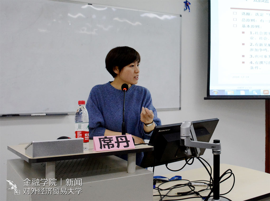 接着,席丹重点强调了在“自圆其说”这一过程中规范化的必要性与重要性。她以一般性论文的构成为经,以对目录、摘要(关键词)、引言、正文、参考文献五个方面的详细阐述为纬,系统讲解了规范的论文格式。首先,她提到好的摘要及目录应一目了然,能清晰地体现论文的主要内容目的和连贯一致的逻辑思路。然后,她指出引言部分应通过背景解读,文献综述和研究工作小结客观阐述论文的实际研究意义和价值。在对关键的正文部分的讲解过程中,席老师提供了一种“从提出实证模型到分析研究数据,从实证分析到得出结论”的科学规范的论文样式,并建议通过阅读文献资料来规范正文写作。在最后,席丹强调参考文献与论文引用应一致。