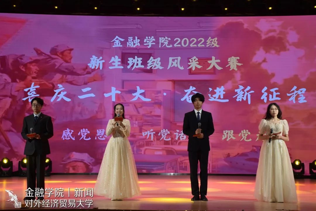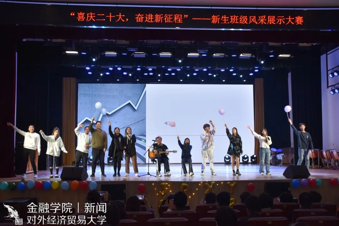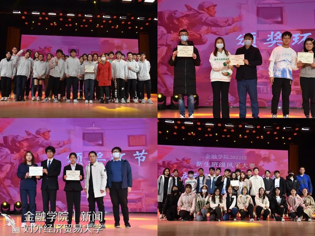 伴随着歌曲,各获奖班级的学生代表上台领奖,在现场的欢声笑语中,2022级新生班级风采展示大赛圆满落幕。在这场盛赛中,各班级的精彩表演展现了金院学子“金鞭美少年,去跃青骢马”的青年之姿、“仰天大笑出门去,我辈岂是蓬蒿人”的少年豪情、“祖国如有难,汝应做先锋”的责任担当,为祖国新时代发展献礼。相信这场相聚亦将在全体金院新生求学之路上留下浓墨重彩的一笔。在这里衷心祝愿2022级金院学子能永远保持积极向上的心态,永远怀揣着热情去追寻自己的星辰大海。