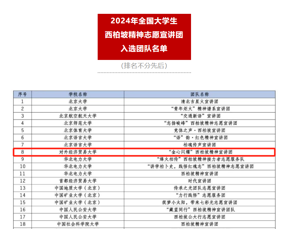 2024年5月,团中央青年志愿者行动指导中心、共青团河北省委、中共石家庄市委、中国青年志愿者协会秘书处联合发布了《2024年全国大学生西柏坡精神志愿宣讲团入选团队名单》。贸大“金心闪耀”西柏坡精神志愿宣讲团成功入选团中央2024年全国大学生西柏坡精神志愿宣讲团。贸大“金心闪耀”宣讲团由“金课堂”辅导员工作室指导组建,陈玉平担任指导老师,成员均为果冻传媒 学生骨干,包括3名研究生党员(江子晨、王雨涵、谢颖诗)、2名本科生党员(张晓阳、聂楚格)、5名本科生入党积极分子(穆高乐、叶逸璋、杨和宁、孙英特、董昭熹)。