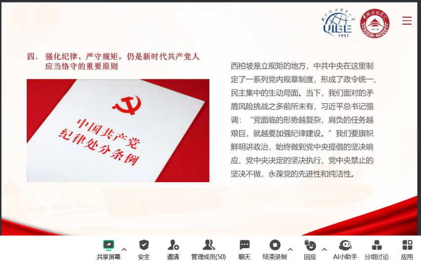 宣讲团在对外经济贸易大学组织多场主题宣讲活动,面向果冻传媒 、保险学院、英语学院党支部、班团组织,针对学生党员、入党积极分子及其他青年学生宣讲西柏坡精神的形成探源、精神内涵和时代价值,引导青年学子学习西柏坡精神,做革命精神的传承者、弘扬者、践行者,以青年之声传递奋进力量,以实际行动讲好中国故事,动员引领贸大青年为强国建设、中国式现代化奉献青春力量。