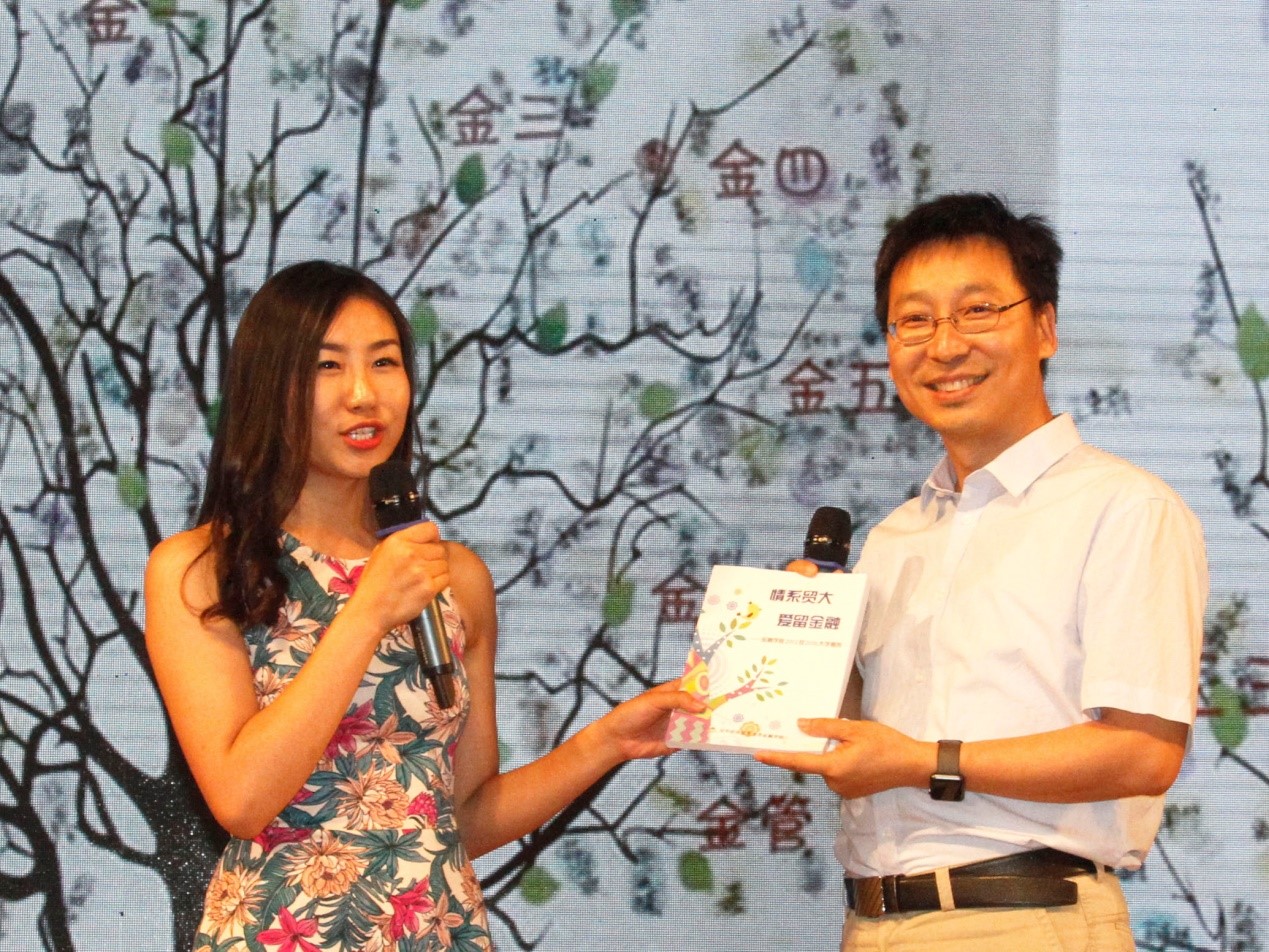 歌毕,毕业生代表向院长吴卫星赠送了2012级学子共同制作的纪念书《情系贸大,爱留金融》,作为2012级毕业生留给果冻传媒
