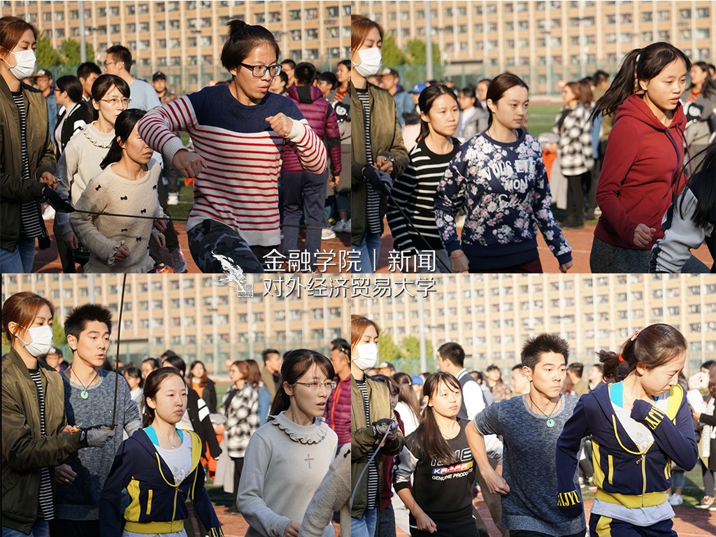 第一次测速不到300→正式比赛零失误398,中间的距离是一个多月的训练,有重度雾霾天带着口罩用绳命在跳绳,有为了全员到齐强行早起7点10分集合,有无数次被绳打到也不喊疼,更有因每一次数量增加而无比欣喜。我们大概是全校最早开始训练的学院,有时会觉得跳到340已经不错了,干嘛还要这么拼,现在想来,正是金融人的精益求精才有了今天破纪录的好成绩。