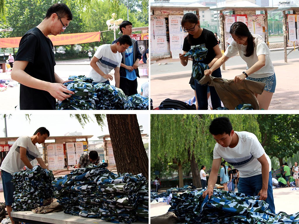 各班代表陆陆续续送来本班学生洗净的军服,有些提不动的就用自行车推来;也有单独的大一学生看到活动便赶回宿舍送来军服献爱心。金院志服团的十位工作人员有条不紊地将收集来的军服按号码分类,一件件叠放整齐。