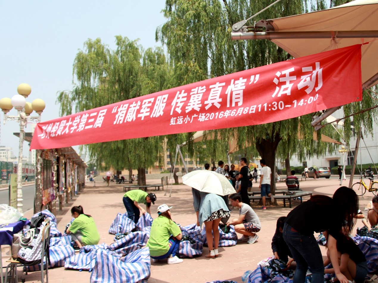捐献军服活动是由北京教育系统关工委发起的大型捐献物资献爱心活动。早在大一学生军训前,学校各志愿团就已经着手准备这次的军服捐献活动,在各微信公众平台上进行宣传,通过学院辅导员、大班长传递信息。前两届我校“捐献军服,传冀真情”活动反响甚佳,今年我校继续积极响应号召,开展了第三届捐献军服活动。本次活动由校学生工作部和关心下一代工作委员会主办,国际商学院牵头,各学院志愿团、学生会参与,爱心社合作承办。