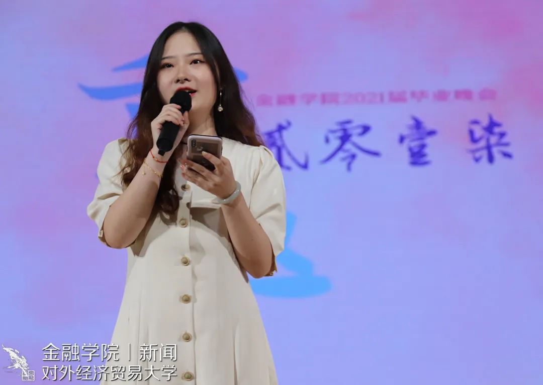 本次晚会别出心裁地采用了“穿越”的形式,并且通过中插《校园生活》、《激情岁月》、《疫情生活实录》、《情侣行为图鉴》、《老师的终极嘱托》或温暖感人或搞笑逗趣的VCR,带领大家重回2017,重新回味大学四年的酸甜苦辣。一开场,就是由罗丹慧同学、林明慧同学、董雪晗同学、何衍萱同学、陈若宁同学以及杨柳祎同学带来动感的舞蹈《Dancin’ Till The World Ends 》,瞬间引爆全场。刘辛夷同学和朱雪昊同学的相声《毕业》调侃了金融学子未来可能从事的相关职业,引起全场哄堂大笑。由常悦同学、贾晨同学、郝伟同学、黄格同学以及吴雨泽同学带来的歌曲串烧《青春爱情故事》带大家重温了大学青涩、朦胧的爱恋故事。接着,由王静茹同学、谢和同学以及李丹阳同学带来优雅、轻盈的古典舞蹈《丽人》以及梁家僖同学带来优美的舞蹈《竹林中》都获得了全场不绝的掌声。李孜仪同学和尚策同学通过前期问卷以及大数据调查,带来精彩的语言《金融统计-探究提升脱单几率的多种手段》。随后,由王天一老师以及谢海滨老师带来的《贝加尔湖畔》+《You Raise Me Up》以及李永龄老师带来吉他弹唱《Green Filed》都得到了全场持久、热烈的掌声。