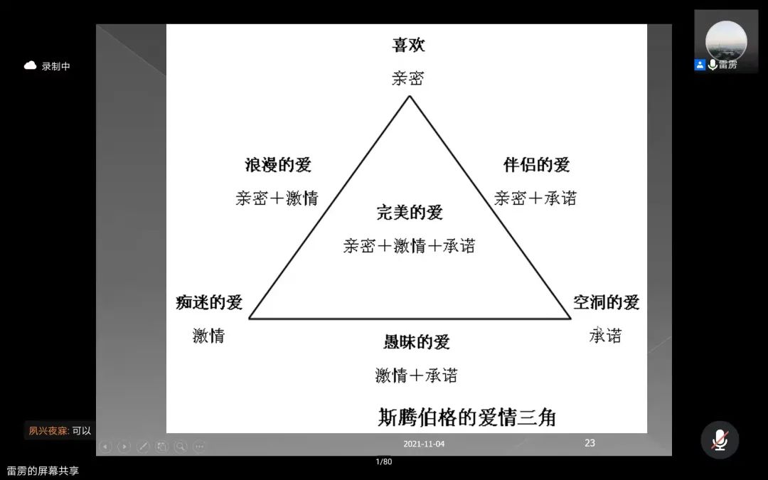 关于爱情,教授以斯腾伯格的爱情三角为例,指出完美的爱应具有亲密,承诺,激情三种要素。值得注意的是,亲密关系所具有的四大敌人——批评指责,轻蔑藐视,狡辩防御,矢口否认可能会造成爱情的流失。