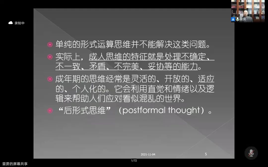 谈及大学生思维活动,雷雳教授认为大学是青年人从黑白分明地看待问题转向成年人“后形式思维”的重要阶段,即拥有处理不确定,不一致,矛盾,不完美情况的思维。而这种思维的转变与提升,帮助人们接纳了人生中的不足,从而有助于增强人们的自我理解与自我接纳的能力,更加稳固自我认同感。