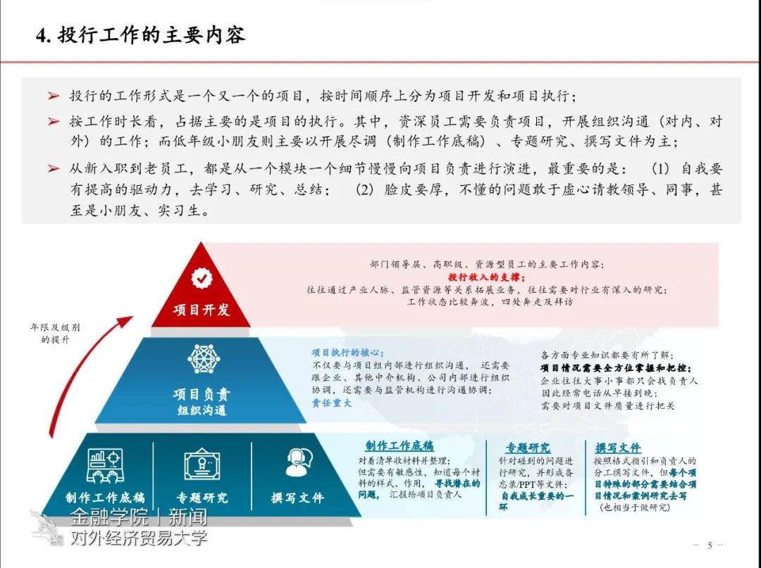 具体到每一个项目,可以从时间顺序上分为项目开发和项目执行两大部分。按工作时长看,占据主要的是项目的执行。其中,资深员工需要负责项目,开展组织沟通 (对内、对外) 的工作;而资历较浅的员工主要以开展尽调 (制作工作底稿)、专题研究以及撰写文件为主。一个员工从新入职到具有一定资历,都需要从一个模块、一个细节慢慢向项目负责进行演进。