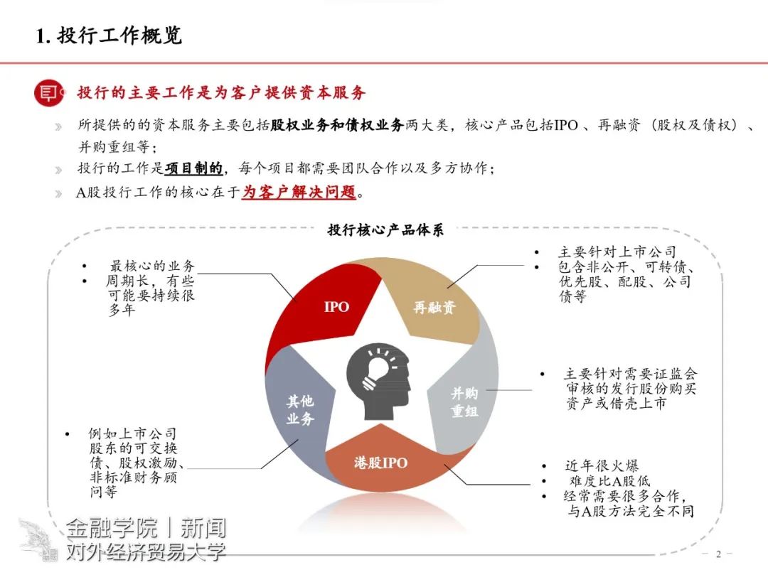 首先,梁文学长详细全面地介绍了投行的工作性质。投行的主要工作是为客户提供资本服务,服务主要包括股权业务和债权业务两大类,核心产品包括IPO 、再融资与并购重组等;投行的工作是项目制的,每个项目都需要团队合作以及多方协作。正因为投行的工作是一个一个项目积攒而成,同时每个项目的工作既复杂工作量又大,所以要想做好工作必须要抓住主要工作要素。在项目开始之前,要制定好整个项目推进的时间表,项目实施过程中设置尽调清单与工作底稿,这也是在为下一步提交申报文件做必要准备。