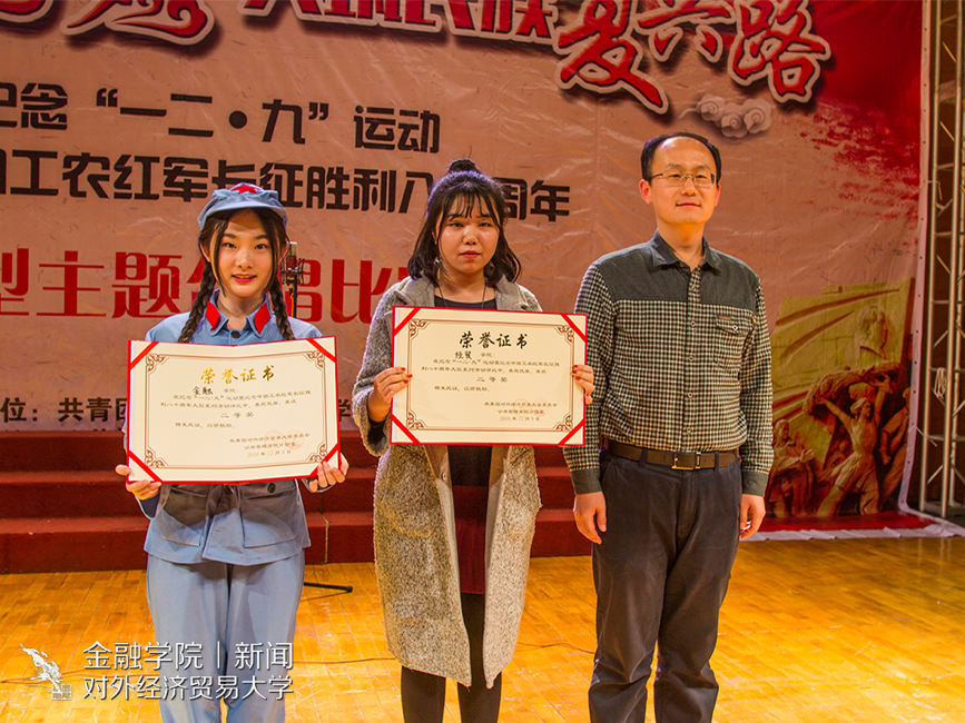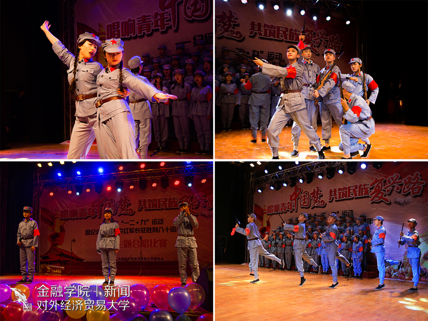 的三名学生演唱了歌曲《中国梦想》,这首歌曲是由《歌唱祖国》改编而来,三位学生配合默契,出色地完成了表演。正如歌里所唱:“中国梦想壮丽辉煌,奋起号角已经吹响,把握我们峥嵘时光,贸大青年扬帆远航。”在这峥嵘岁月里,贸大学子们定会扬帆远航。