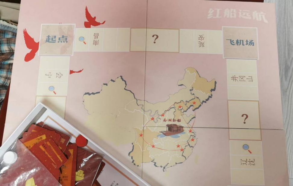 随后,许沈崇智同学为老师们与同学们介绍了自己作为项目成员参与制作的“红船远航”党史教育桌游:“1921年嘉兴红船中国共产党成立到1949年北京开国大典,中国共产党的发展路线在中国地图上构成了一个类几何圆形,我们团队因此受到启发,自主开发设计了一套以红色党史为主题的沉浸式桌游”。许沈崇智同学表示:“这款桌游是以从中国共产党建立到开国大典这28年的历史为基础,玩家在进行棋牌游戏的时候,要密切关注自己的中国地图行进路线,只有根据历史发展顺序顺利打卡每一个地点,最终首先到达北京的玩家才算获得胜利。通过参与游戏,玩家可以对中国共产党的发展历程有更加清晰的认识,在游戏进行过程中强化记忆发展顺序,在潜移默化中学习党史知识。”