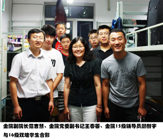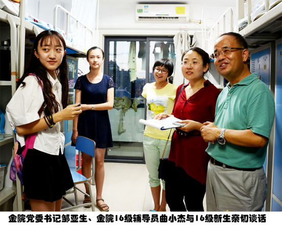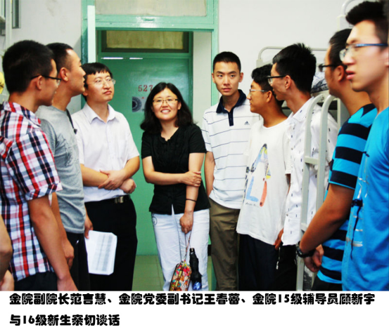 党委书记邹亚生,党委副书记王春蕾,副院长范言慧,分团委书记陈玉平前往学生寝室看望新生,与大一学生进行亲切交流。同行的还有15级辅导员顾新宇,16级辅导员曲小杰以及新生班主任助理。学院领导详细地询问了新生的基本情况以及他们对学校的适应情况,同时也就安全、学业、生活等方面对新生进行了嘱咐。