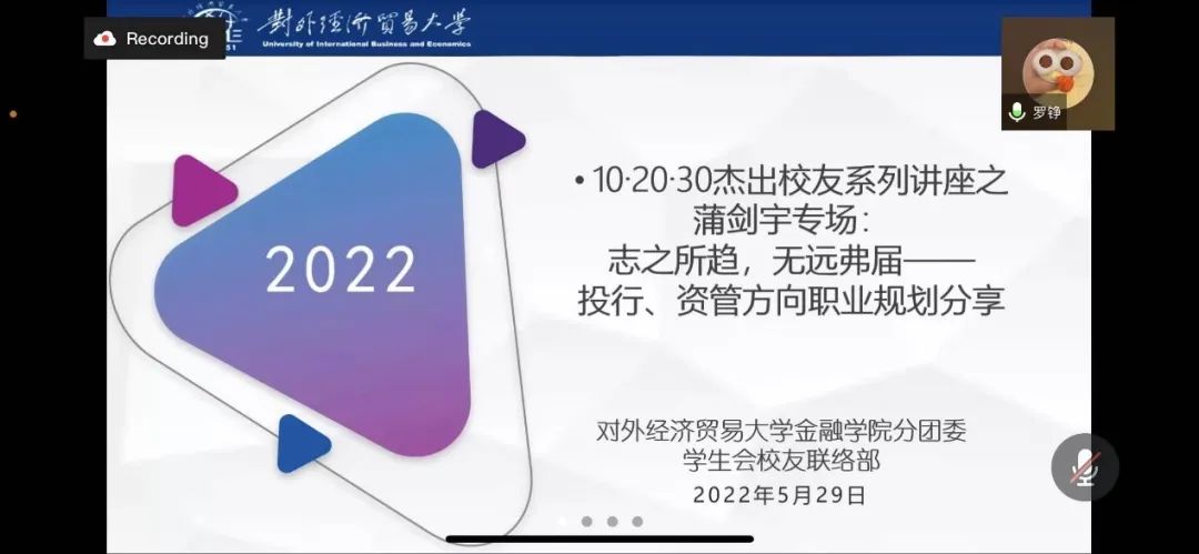 2022年5月29号上午9点,由果冻传媒 投资系组织筹划,果冻传媒 分团委学生会校友联络部承办的果冻传媒 10·20·30杰出校友系列讲座之蒲剑宇专场“志之所趋,无远弗届——投行资管方向职业规划分享”顺利举办。