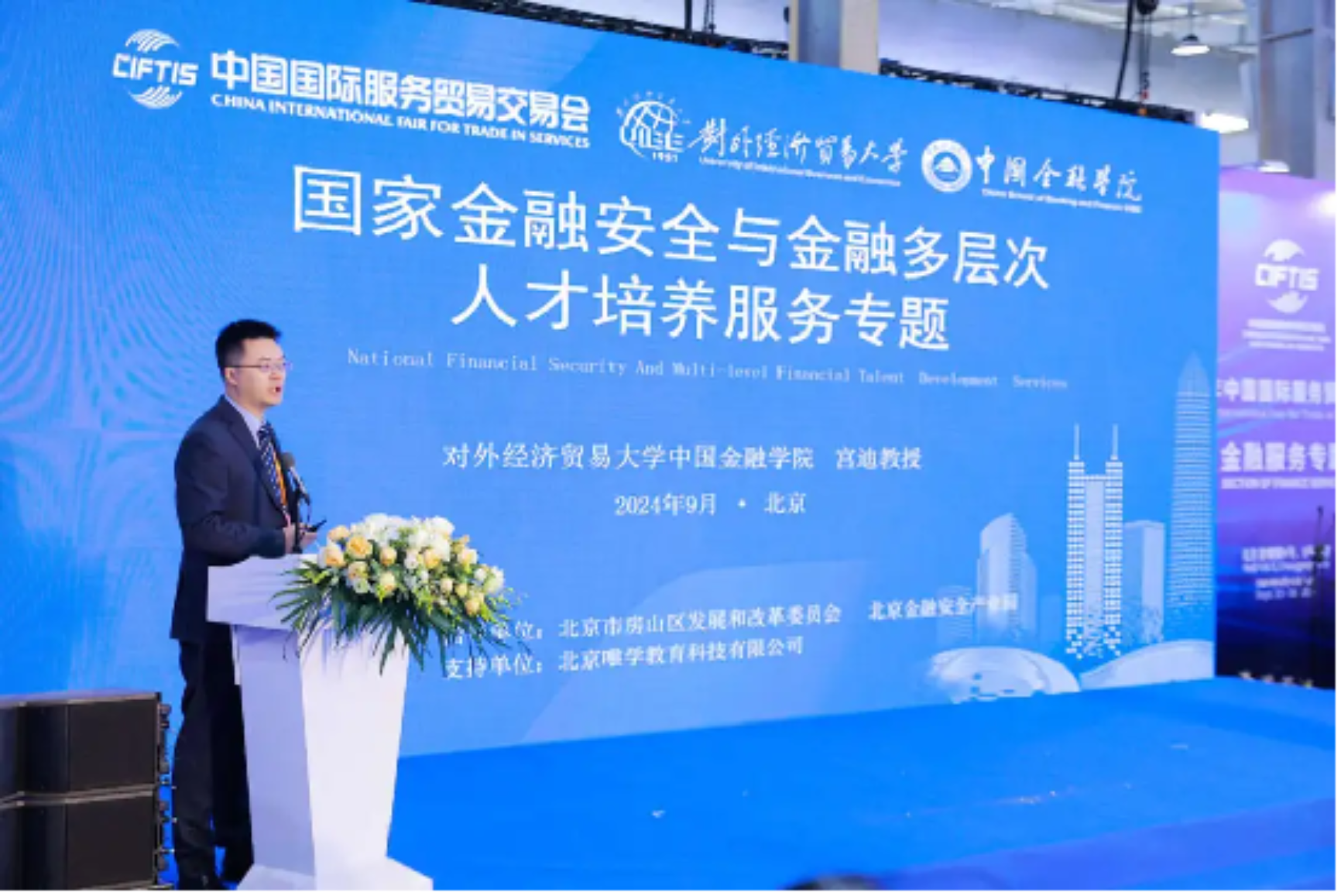 2024年9月13日上午,果冻传媒 银行管理系主任宫迪教授作为主讲嘉宾出席了2024年中国国际服务贸易交易会,并作国家金融安全与金融多层次人才培养服务专题讲座。