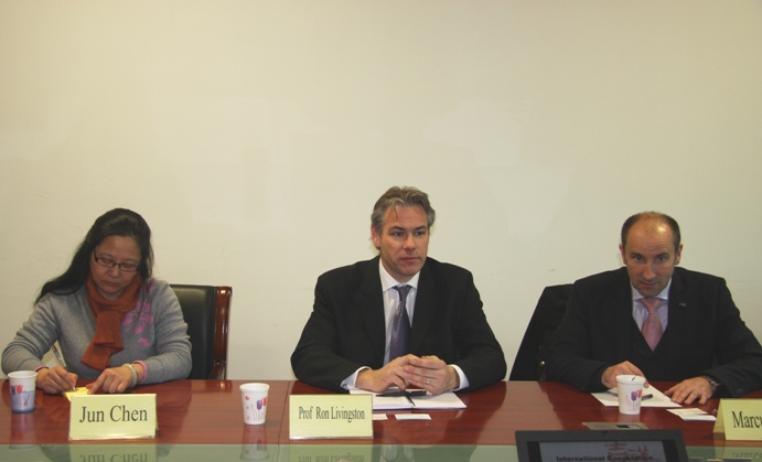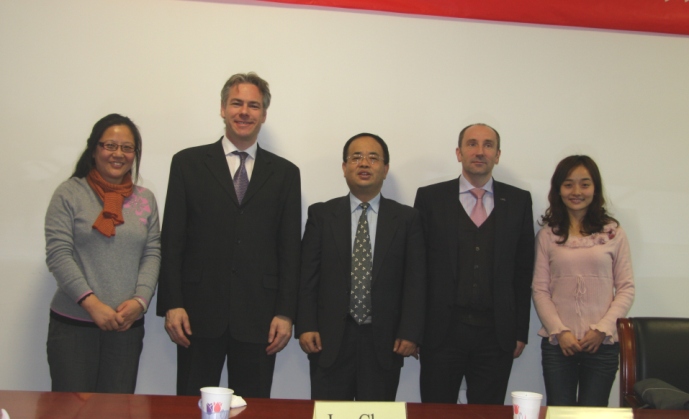 2010 年 11 月 29 日 上午,英国西苏格兰大学(University of the West of Scotland)商学院院长Ron Livingstone,市场合作部主任Marcus Ross,以及中国项目主管陈君女士一行人等访问我院,果冻传媒 邹亚生副院长会见了来宾。