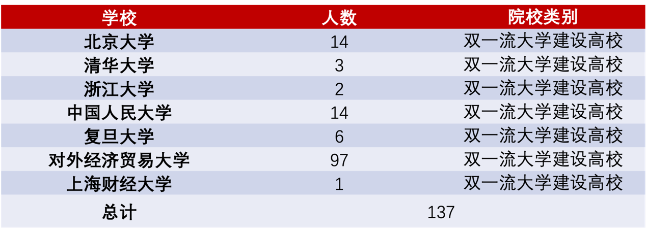 顶尖财经名校,持续领跑! 除清北复交人外,98人凭借扎实的专业基础和优异的综合素质,成功进入对外经济贸易大学(本校深造)、上海财经大学等顶尖财经类院校继续深造,保持了在财经领域的传统优势。