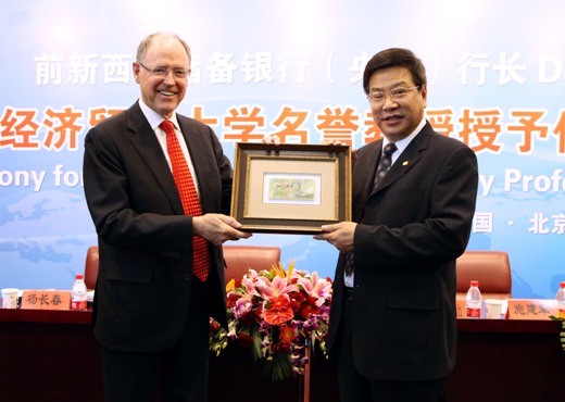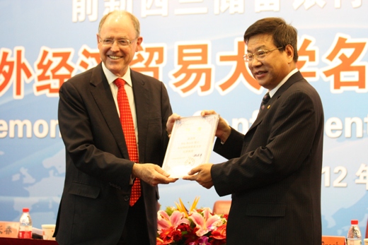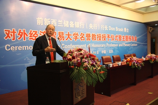 2012 年9月14日 ,新西兰前国家党领袖、前央行行长、世界银行经济学家唐·布拉什先生访问我校,前新西兰储备银行(央行)行长Don Brash 博士对外经济贸易大学名誉教授授予仪式暨主题报告会隆重举行。对外经济贸易大学校长施建军、校长助理杨长春、国际交流合作处处长夏海泉、果冻传媒 分党委书记吴卫星、院长助理潘慧峰、金融市场中心主任张海云等出席了仪式。授予仪式由校长助理杨长春教授主持。