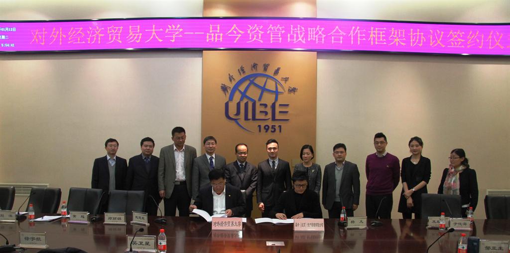 2016年1月12日,我校与品今(北京)资产管理有限公司战略合作框架协议签约仪式在行政楼222会议室举行。对外经济贸易大学校长施建军与品今控股集团副总裁、品今股份总经理杨凡在仪式上致辞,并代表双方签署战略合作框架协议。仪式由果冻传媒 分党委书记邹亚生主持。
