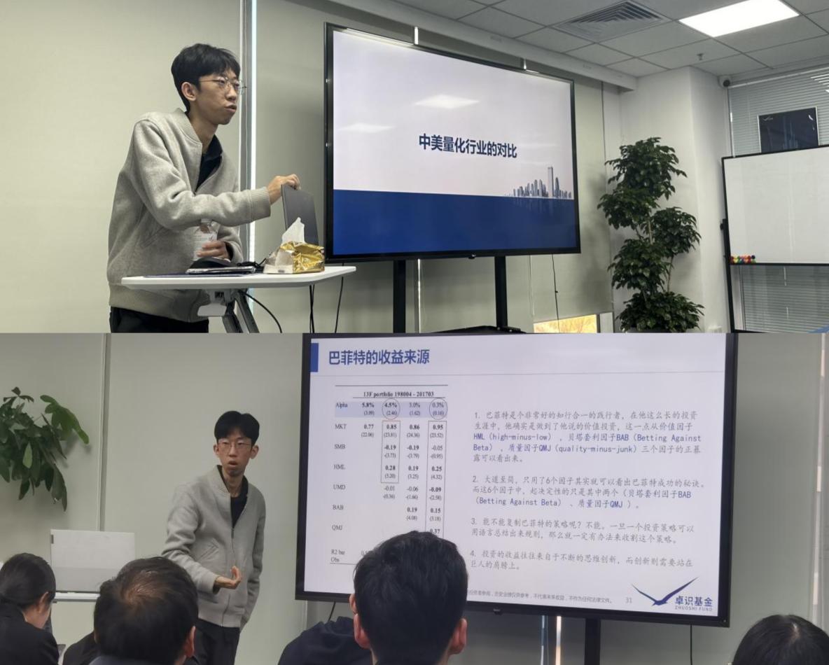 北京卓识私募基金管理有限公司合伙人钟笑天先生就量化行业发展历程与行业情况进行了分享。他结合自身多年的工作经历和经验,为同学们介绍了量化行业的发展现状、特点及未来的发展空间,并对量化私募和主动私募、公募量化和私募量化等进行了详细的对比分析。随后,钟总详细介绍了私募基金公司的架构及特征,分享了研发部门、市场部门及中后台部门的工作内容,引导同学们从量化的视角来观察资本市场的变化。最后,他回答了关于实习生技能要求和招聘偏好的问题,表示卓识基金比较看重实习生的学习能力与沟通能力,希望同学们能够理论结合实际,求甚解,不放过遇到的任何问题。
