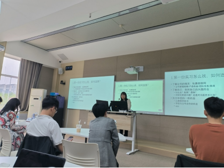 首先,校友刘凡就“首份实习寻找与选择策略”展开了生动细致的讲解,分享了如何定位适合自己的实习岗位,以及如何通过有效渠道获取实习机会,关于职业发展方向的确立,刘凡鼓励同学们尽早思考自身兴趣与职业定位,并给出了多种途径来辅助同学们发现并锁定最适合自己的职业道路。最后刘凡就当前的就业形式,金融工程人才的就业空间结合业界实践进行了展望。