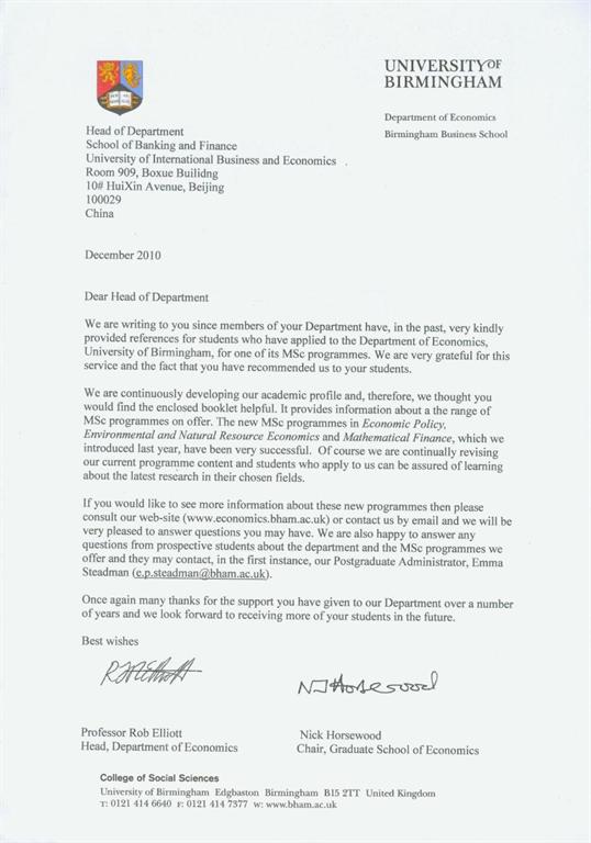 2011新年伊始,我院收到了英国伯明翰大学经济系发来的感谢信。信中,伯明翰大学对我院与之合办的1+1硕士留学项目给予了高度的评价,并对我院长期以来对本项目在学生选拔与推荐、预科学习与考核等工作的大力支持表示感谢。