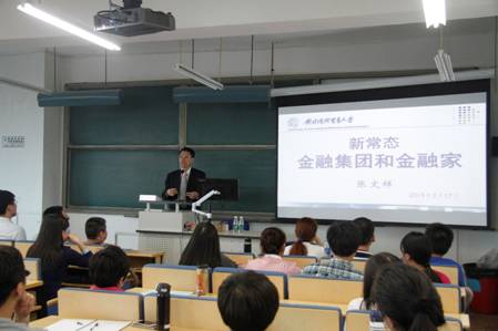 讲座中,张文祥教授运用自己从业以来的深厚积淀,向大家讲授了经济新常态下的金融集团现状、前景及当代金融家必须具备的素质。他以中国银行、中信集团和平安集团为例,介绍了中国大型金融集团目前的发展状况,并从金融集团组成链角色、层面机构、运营监测和全面监管四个维度层层深入,剖析金融集团的经营架构和治理模式。并从丰富而生动的案例中概括了当代金融家必备的三大能力,即:系统化战略思维能力、多条线多板块协同能力和多元化平台产品整合能力。他指出,未来的金融业将会从以商业银行为核心的金融体系转变成为以金融集团为核心的金融体系,作为贸大果冻传媒 的学子,应该肩负重任,“在位做事,越位思考”,积极培养系统化的战略思维,拓展视野,将自己打造为具有“国际范儿”的金融家,为新常态下中国金融事业的发展贡献应有之力。