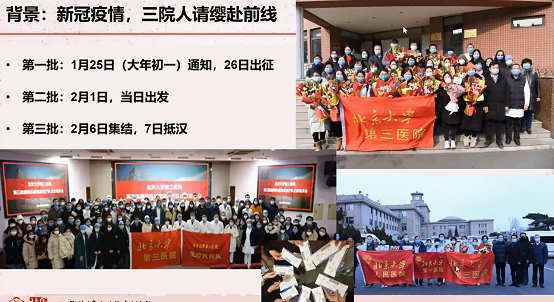 北医三院第一批援鄂医疗队是大年初一出发的,第二批是2月1日出发的,刘烨是第三批,2月6日出发的。她说,“出发当天下午四点左右接到通知,五点开始培训,七点就出发了。时间非常紧,连行李都来不及准备,当晚北京还下起大雪,飞机无法起飞,直到次日清晨,临时增加一个包机航班飞到武汉。”可能很多人有疑问,这些队员是选拔出来的?还是自愿去的?刘烨说,“不能说是100%但至少90%以上是主动请缨的,能被选作抗疫人员,大家感到非常光荣。”