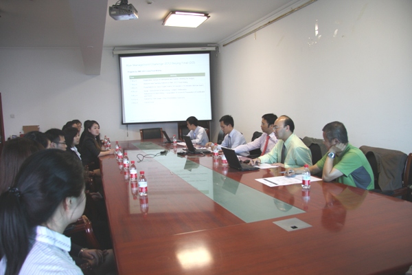 2012 年5月21日 下午13:30,埃森哲风险管理挑战杯竞赛北京赛区决赛在我校博学楼925开始举行,果冻传媒 张海云教授应邀加入评审团。进入北京赛区决赛的4个团队分别为代表我校的Forerunner队(周杰、殷琳、黎操)和Sunflower队(许争、戚新、周茜)、代表中央财经大学的NOVA队、代表北京师范大学的Blossom队。赛事全程使用英语,包括演讲与问答环节。Forerunner队凭借对系统性风险(Systemic Risk)的深入理解、丰富的量化分析模型、精致的PowerPoint演示文稿、流利清晰的英语表达,以及问答环节的出色表现,最终在4个团队中力拔头筹,获得北京赛区冠军,并成功晋级大中华区总决赛。在随后的几天里,Forerunner队进一步优化研究报告细节,积极备战大中华区总决赛。