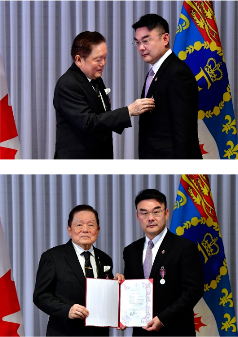 加拿大联邦参议员Victor Oh 代表加拿大政府为姜睿佩戴勋章并颁发证书