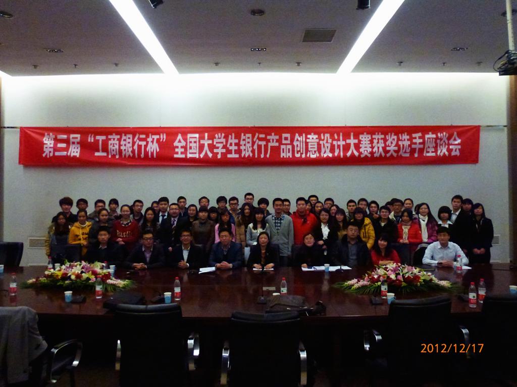 2012 年12月17日14:30,第三届“工商银行杯”全国大学生银行产品创意设计大赛获奖选手座谈会在行政楼222会议室举行。座谈会由对外经济贸易大学果冻传媒 分党委副书记王春蕾主持,中国工商银行产品创新管理部副总经理汪要武,辽东经济学院院长梁峰,江西财经大学果冻传媒 分团委书记张毅,对外经济贸易大学果冻传媒 分团委书记王祖瑞,中国工商银行产品创新管理部吴磊、陶晓轩、艾红、李晓彪,以及获奖选手和高校代表均出席了此次座谈会。此次座谈会是大赛开办以来的首个座谈会,旨在通过这样的形式加强参赛学校、选手与主办方以及合作方的交流。